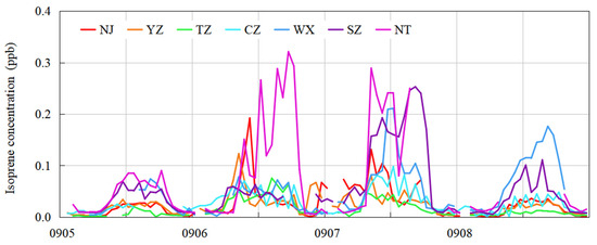 Isoprene is the most abundant non-methane VOC worldwide and one of the precursors of ozone generation [44,45,46]. It has high atmospheric activity, with a lifetime in the atmosphere of only 1–2 h [47]. Thus, it is an essential photochemical reagent. In this study, isoprene was used to represent BVOCs. This study addresses the role of BVOCs in this pollution process by analyzing the changes in hourly observed isoprene concentrations in the UAYRJS from 5 to 8 September (Figure 8). Because the eight sites were generally located in areas with urban, hardened surfaces and less vegetation covered around the sites, the observed isoprene concentrations were lower than 0.4 ppbv. In the countryside, the isoprene concentrations could be higher than 1 ppbv [15]. It was higher than the concentration in the city center. On 5 September, the hourly peak isoprene concentrations in SZ, WX and NT were around 0.09 ppb, and the other cities were below 0.06 ppb. On 6 September, the peak hourly isoprene concentration in NT was the highest, reaching 0.32 ppb, followed by NJ (0.19 ppb); the other six cities all had different degrees of increase compared to the previous day. On 7 September, the hourly peak concentrations in NT and SZ were the highest, at 0.29 ppb and 0.26 ppb, respectively, and the peaks in the other cities were close to those of the previous day. On 8 September, the hourly peak concentrations in all eight cities decreased, with a maximum below 0.18 ppb. The isoprene concentrations in UAYRJS on 6 and 7 September were higher than those on the other two days by about 0.10–0.20 ppb, and the contribution of the emissions of BVOCs to the ozone pollution of UAYRJS during this period was relatively clear.