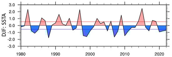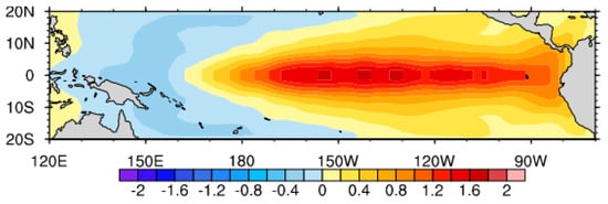 The El Niño-Southern Oscillation (ENSO) is the strongest air–sea coupling phenomenon in the world, exhibiting a sea surface temperature anomaly (SSTA) in the eastern equatorial Pacific [1,2,3]. During El Niño (La Niña), the positive (negative) SSTA causes anomalous westerly winds (easterly winds) and enhanced (reduced) precipitation in the tropical central Pacific [4,5]. ENSO not only impacts local weather and climate but also modulates global climate through teleconnections [6]. ENSO is considered as a significant source of predictability for global climate. It is necessary to understand its characteristics and air–sea interaction processes.