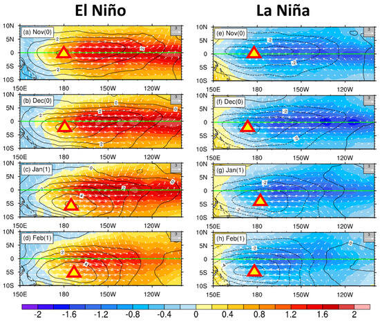 Composite SSTA (shading, K), anomalous surface wind (vector, m/s) and anomalous zonal wind averaged over 1000–700 hPa (contour, m/s) in Nov(0)–Feb(1) for (a–d) El Niño and (e–h) La Niña. The triangles mark the maximum (minimum) of anomalous zonal wind for El Niño (La Niña).