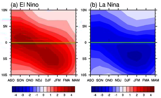 Time evolution of 1000–700 hPa anomalous zonal wind (m/s) averaged over 160° E–160° W for composite (a) El Niño and (b) La Niña.