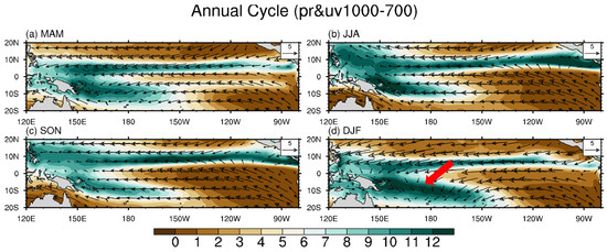 The seasonal cycle of mean precipitation (shading, mm/day) and mean wind averaged over 1000–700 hPa (vector, m/s). The climatological mean period is 1980–2023. The red arrow in (d) represents the cross-equatorial northerly in boreal winter.