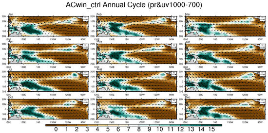 The annual cycle of mean precipitation (shading, mm/day) and mean 1000 hPa wind (vector, m/s) in ACwin_ctrl.