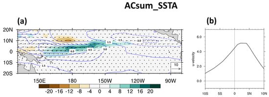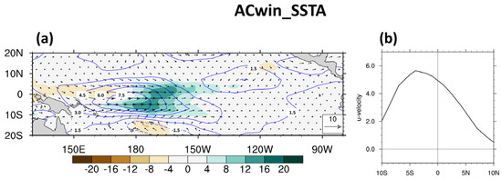 We then conduct the same anti-symmetric zonal momentum budget as Gong and Li (2021) [18] for ACwin_SSTA (Figure 8). The budget result shows the major contributor is the meridional advection, which is related with the cross-equatorial mean northerly in boreal winter. The pressure gradient force also plays an important role. The asymmetric pressure gradient force is attributed to the asymmetric precipitation response. The mean SST is warmer in the southern hemisphere during boreal winter, and the superimposed warm SSTA is more likely to trigger precipitation anomalies. Further, the larger anomalous zonal wind could advect larger amounts of moisture from the western Pacific in the southern hemisphere, inducing a stronger precipitation response and wind response in this situation [18].