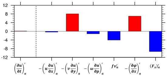 where u, v, ω denote the 3-dimensional (3D) wind, denotes the zonal wind tendency, , , and are 3D advection terms, is the Coriolis parameter, φ denotes the geopotential height, and denotes the apparent momentum sink term that is calculated using daily raw data and the original zonal momentum equation following Yanai et al. (1973) [24]. A prime denotes the interannual anomaly, and subscript a represents the anti-symmetric component of each term.