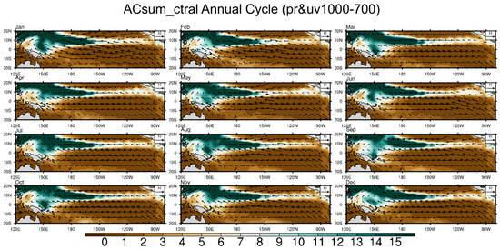 The annual cycle of mean precipitation (shading, mm/day) and mean 1000 hPa wind (vector, m/s) in ACsum_ctrl.
