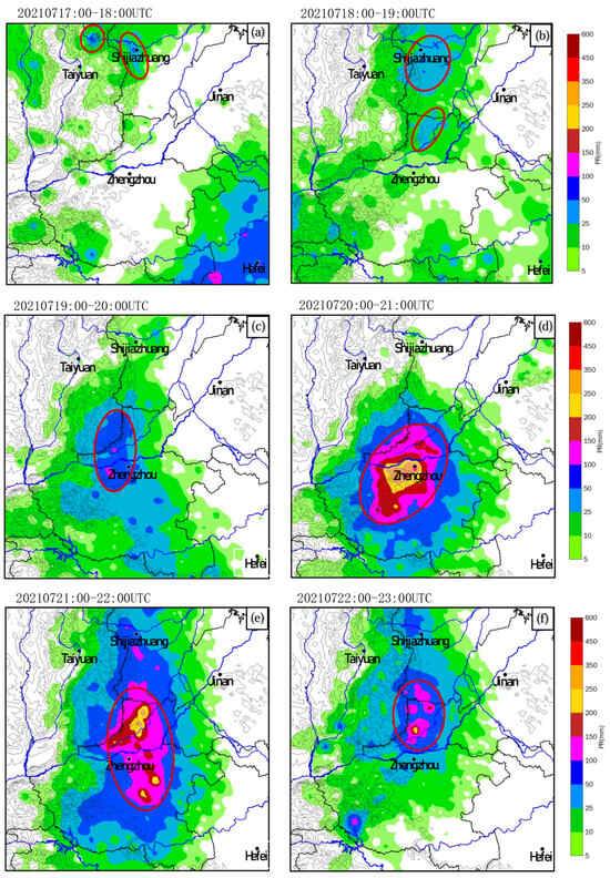 Figure 1 shows the daily precipitation of CHM_PRE from 00 UTC on July 17 to 00 UTC on July 23. To be consistent, all times used in this research are in Coordinated Universal Time (UTC). The Digital Elevation Model (DEM) reflects the physical surface of the earth and provides the basis for the modeling and analysis of spatial-topographic information [28,29]. The DEM is essential in hydrological modeling and water cycle understanding [30]. In this study, the DEM is crucial for predicting and analyzing the impact of topography on precipitation. To indicate the relationship between the orographic height and precipitation distribution, the contours of topographic height are illustrated in Figure 1. The color shadings in Figure 1 demonstrate the main characteristics of this extreme rainfall event. On the 17th, weak rainfall centers circled with red mainly occurred near Shijiazhuang, Hebei Province, and Xinzhou, Shanxi Province, with a daily rainfall intensity of around 25 mm appearing at the junction of the Taihang Mountains in northwest Henan and the plains (Figure 1a). On the 18th (Figure 1c), the rainfall area in Hebei Province significantly expanded, with the maximum daily rainfall intensity exceeding 50 mm. Rainbands in northern Henan moved southeastward, intensifying and expanding (Figure 1b). On the 19th, precipitation intensified further, with a rainband located from the east of the Taihang Mountains in Henan to the western part of Zhengzhou where the maximum daily rainfall intensity exceeded 100 mm. A long-duration heavy rain event occurred on the 20th, with the main precipitation area in the central part of Henan and the rainfall in Zhengzhou exceeding 400 mm (Figure 1d). The extreme hourly rainfall at the Zhengzhou station reached 201.99 mm between 08 and 09 UTC on the 20th. On the 21st, the rain area moved northward to affect northern Henan and southern Hebei, with the main precipitation center exceeding 300 mm (Figure 1e). On the 22nd, the precipitation center was at the border area and the junction of Henan and Hebei, with a reduced rainfall intensity. However, the maximum intensity still exceeded 200 mm (Figure 1f). Precipitation gradually weakened after the 23rd (figure omitted). The most intense rainfall period appeared from the 20th to the 22nd. Two severe rainfall centers occurred successively in the central (Zhengzhou) and northern parts of Henan (Xinxiang, Hebi, and Anyang). Rainfall in the central part of Henan was from 00:00 on the 20th to 00:00 on the 21st, while in northern Henan, it was from 00:00 on the 21st to 00:00 on the 22nd.