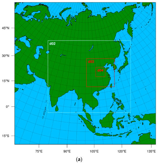 The WRF version 4.4.2 with the Lambert conformal conic projection (Figure 2a) and 4 domains nested is used for this study. One-way nesting is used from the coarser grid domain to the finer grid domain where the coarser grid domain provides lateral boundaries for the finer grid domain, and the results of the finer grid domain do not impact the coarser grid domain. To reduce errors introduced by the lateral boundaries, the outmost domain D01 with a horizontal grid spacing of 27 km is set to cover a large area of approximately 10,000 km east–west and 10,000 km north–south, extending from about 40° E to 160° E and from about 18° S to 81° N, with the model center at (100° E, 35° N). The second domain D02 has a horizontal grid spacing of 9 km, D03 with a horizontal grid spacing of 3 km, and D04 with a horizontal grid spacing of 1 km. Rainstorms occurred near the center of D04. The model uses 55 vertical levels with a model top at 5 hPa, approximately 30 km in height.