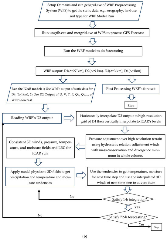 (a) Four nested domains for the WRF model. (b) Flowchart for the WRF model and the ICAR model runs.