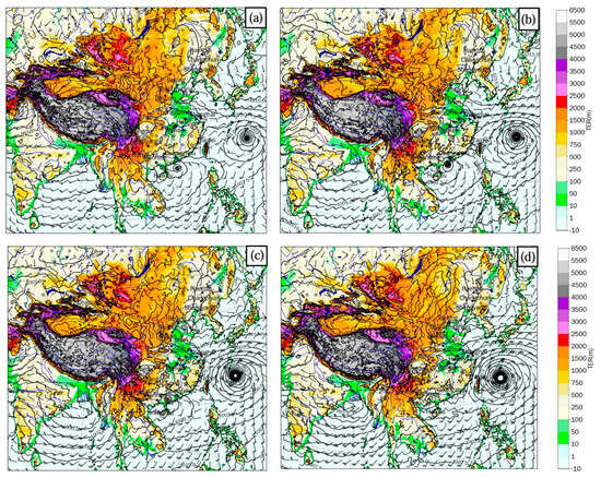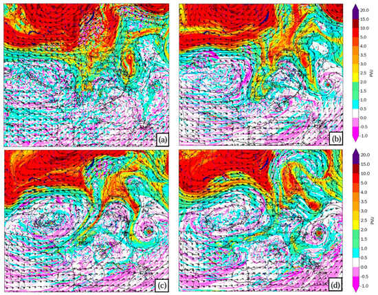 (a–d) represents the surface pressure and wind field obtained for the forecast at 0, 1, 2, and 3 days, respectively, starting from 00 UTC, 19 July 2021. Same as Figure 3 but shows the geopotential height (contours), winds (barbs), and potential vorticity (shading) on the 200 hPa pressure surface.
