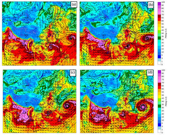 (a–d) represents the surface pressure and wind field obtained for the forecast at 0, 1, 2, and 3 days, respectively, starting from 00 UTC, 19 July 2021. Same as Figure 3 but shows the geopotential height (contours), winds (barbs), and atmospheric precipitable water (shadings) on the 850 hPa pressure surface.