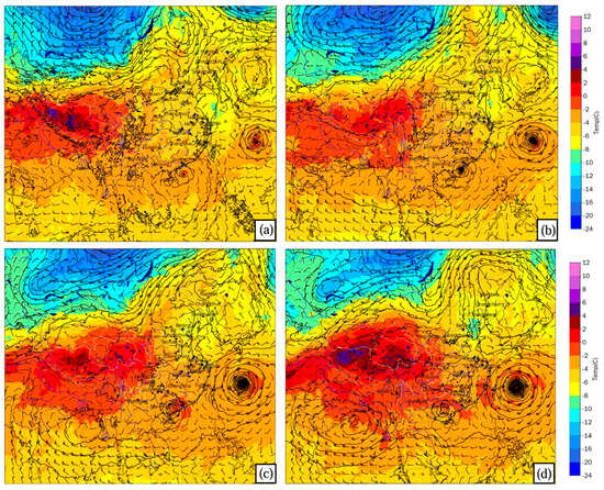 (a–d) represents the surface pressure and wind field obtained for the forecast at 0, 1, 2, and 3 days, respectively, starting from 00 UTC, 19 July 2021. Same as Figure 3 but shows the geopotential height (contours), winds (barbs), and temperature (shadings) on the 500 hPa pressure surface.
