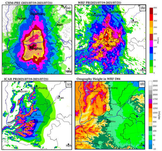 We have discussed the synoptic backgrounds that led to the Henan 21.7 Rainstorm. Now we pay attention to precipitation forecasts and their reliability. At first, we evaluate the 3-day total precipitation predicted by the WRF and the ICAR models with CHM_PRE as an observation. In this subsection, we assess the precipitation through visual comparison with the observation. Figure 7a–c shows the 3-day total precipitation in CHM_PRE and the forecasts of WRF and ICAR from 00 UTC on July 19 to 00 UTC on July 22. Figure 7d shows the terrain height in D04. The extreme rainfall of the Henan 21.7 Rainstorm occurred during this period. The precipitation forecasts for other times can be seen in the supplementary materials.