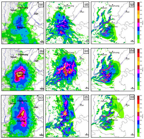 (a–c) shows the 24 h accumulative precipitation of CHM_PRE, while (d–f) depicts the first, second, and third day accumulative precipitation forecasted by WRF, and (g–i) represent the first, second, and third day accumulative precipitation forecasted by ICAR. Both models are initialized at 00 UTC on 19 July 2021. The gray dashed lines in (d–f) correspond to the precipitation bands on the slope of the Taihang Mountains in (g–i).