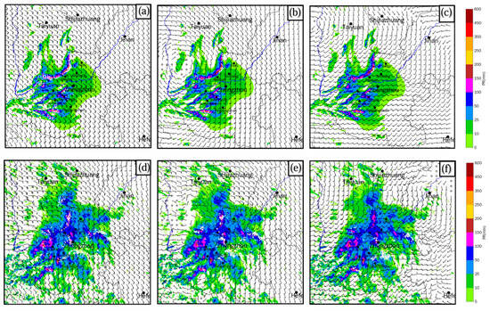 The 36 h wind field (barbs) at 2 km, 5.5 km, and 8.5 km heights and the 12 h accumulative precipitation (color-filled) from 00 to 12 UTC on 20 July 2021, with models starting from 00 UTC on 19 July: (a–c) ICAR; (d–f) WRF. Additionally, the white contour lines represent instantaneous vertical velocities of 1, 2, and 3 m s−1 at the 36 h lead time.