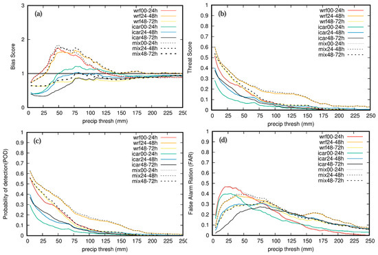 BS: A measure of precipitation frequency forecast, BS = 1 perfect, BS > 1 over-forecast, BS < 1 under-forecast. TS: A measure of precipitation forecast accuracy, TS = 1 perfect, TS = 0 no forecasting skill. POD: Probability of detection for precipitation forecast, POD = 1 perfect, POD = 0 no forecasting skill (similar to TS). FAR: False alarm rate for precipitation forecast, FAR = 0 perfect, FAR = 1 no forecasting skill. A single index cannot fully reflect the skill of precipitation forecasting, several indices must be used in combination to roughly estimate the quality of precipitation forecasts.