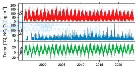 Time series (1995–2023) of hourly averaged surface O3 [µg/m3] (top), NOx [µg/m3] (middle) and air temperature [°C], (bottom panel).