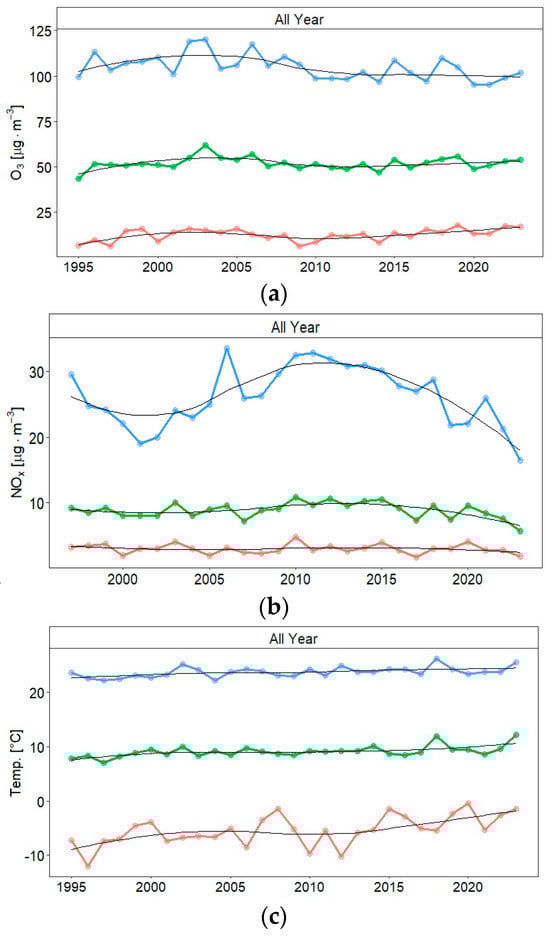 The 5th percentile (red), median (green) and 95th percentile (blue) percentile for each year during the 1995–2023 period: (a) O3 data; (b) NOx data; (c) temperature data. The black curve indicates the smoothed pattern by the Lowess smoother.