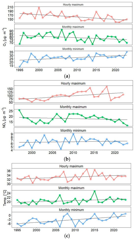 Time series of monthly extremes (monthly minimum-blue, monthly maximum-green) and hourly maximum (red) in each year during the period of 1995–2023: (a) O3 data; (b) NOx data; (c) temperature data. Lines are from standard least squares regression.