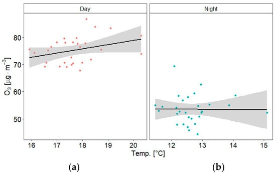 The average O3 concentrations for the daylight period ranged between 67.9 and 86.8 µg/m3 and temperature varied between 15.9 and 20.3 °C, while during night the corresponding ranges were 44.4–69.4 µg/m3 and 11.5–15.1 °C. An increase in the daylight O3 with temperature can be estimated from the slope of the regression line shown in Figure 4a. For the night data (Figure 4b), O3 changes appeared to be independent of the temperature. A weak (but statistically significant) correlation coefficient of 0.33 was calculated for the daylight period, while the correlation coefficient was −0.01 for the night data. The increasing rate of 1.56 ± 0.87 µg/m3/°C (p-value of 0.08) and −0.04 ± 1.37 µg/m3/°C (p-value of 0.98) was obtained from the slopes of the regression line for the daylight and night data, respectively.