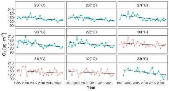 Figure 5 shows the annual time series of maximum O3 concentrations found when the temperature was within the selected intervals of 1 °C width. The intervals were from 24.5–25.5 °C up to 32.5–33.5 °C. Negative trends in the O3 maxima can be guessed from the slopes of the regression line fitted to the maxima variations in 1995–2025. For more than half of the intervals, i.e., 25, 26, 27, 28, 29 and 33 °C ± 0.5 °C, the negative trends were statistically significant with the rate of −1.0 ± 0.2 µg/m3/y, −1.1 ± 0.2 µg/m3/y, −1.5 ± 0.3 µg/m3/y, −1.5 ± 0.4 µg/m3/y, −1.0 ± 0.4 µg/m3/y and −1.5 ± 0.7 µg/m3/y, respectively.