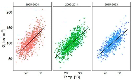 Scatter plot of daily O3 maximum versus corresponding temperature maximum for three consecutive periods (points): 1995–2004, 2005–2014 and 2015–2023. The black line indicates a linear regression. The slope of this line provides the value of the ozone–climate penalty.