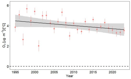 The ozone–climate penalty factor, m O3−T, is defined here as the value of the slope of linear regression of the daily 1 h O3 maxima on the corresponding temperature maxima. The calculations of m O3−T values were performed for summer season (June, July, August) for three consecutive periods: 1995–2004, 2005–2014, and 2015–2023. For these periods, Figure 6 shows scatterplots of the daily O3 maxima versus temperature maxima, along with a linear regression to estimate m O3−T value (the slope of the line). The highest m O3−T value of 4.40 µg/m3/°C was found in the first period (1995–2004). For the next period, m O3−T value was lower (4.04 µg/m3/°C), and the smallest one of 3.93 µg/m3/°C was found in the last period. The steady decrease in these decadal m O3−T values suggests a downward trend in m O3−T values throughout the entire observation period. This is confirmed by the negative trend equal to −0.031 ± 0.018 µg/m3/°C/y (p-value of 0.10) found in the annual time series of m O3−T from 1995 to 2023 (Figure 7).