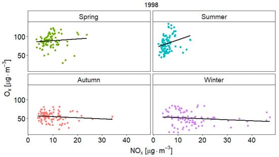 Scatter plot of daylight means of Ox concentration versus corresponding NOx concentrations in four seasons in 1998 (points). The black line represents the linear least squares regression.