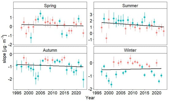 Slopes (“local” contribution to Ox variability—dimensionless values) of the linear regression of daylight mean Ox on daylight mean NOx concentrations for each season from 1995 to 2023. Statistically significant and insignificant slopes are marked by blue and red points, respectively. The black solid line represents the standard least squares regression fit. Vertical bar provides standard deviation of the slope estimate.