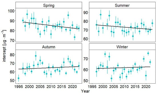 Over the entire period of measurements (1995–2023), statistically significant positive trends are found in the year-round data for the 5th percentile (0.15 ± 0.07 µg/m3/y), and a negative trend for the 95th percentile (−0.38 ± 0.14 µg/m3/y). In addition, statistically significant seasonal trends were identified, i.e., positive for the 5th percentile (0.20 ± 0.07 µg/m3/y in the winter) and for the median (0.28 ± 0.08 µg/m3/y in the winter), and a negative trend for the 95th percentile (−0.44 ± 0.15 µg/m3/y in the spring, and −0.50 ± 0.21 µg/m3/y in the summer).