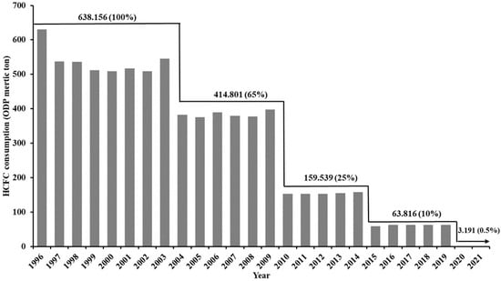- The national baseline for HFCs consumption was set at 24,523,864.2 metric tons CO2eq. The staged consumption reduction targets were 22,071,477.8 metric tons CO2eq since 1 January 2029 (90% of the baseline), 17,166,704.9 metric tons CO2eq since 1 January 2035 (70% of the baseline), 12,261,932.1 metric tons CO2eq since 1 January 2040 (50% of the baseline), and 4,904,772.8 metric tons CO2eq since 1 January 2045 (20% of the baseline).