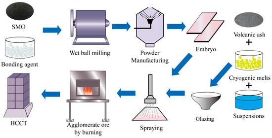In this study, each HCCT consisted of a green body and a glaze layer. The green body was composed of raw materials in the following weight percentages: 80% volcanic ash with a nano-mesoporous structure, 15% borax, and 3.5% silica-based mesoporous oxide. Fumed silica with a specific surface area of 200 m2/g was used as an additive. Slurries of volcanic powder with 0–4% fumed silica were prepared with distilled water and 0.5% sodium polyacrylate, resulting in a mixture mass ratio of 1:1. The slurries were planetary-milled for 30 min. The resultant powders with 4.2–15.1% water content were prepared by drying, granulating, and sieving through a 30-mesh sieve. Green bodies (dimensions: 8 × 45 × 95 mm) with different SMO contents were formed by dry-pressing the resultant powders at 9 MPa. The green bodies were dried at 120 °C in a drying oven and fired in an electrically heated muffle furnace (Nabertherm P330) with an air temperature heating rate of 5 °C/min and a holding time of 30 min. The glaze layer included the following weight percentages: 35% SiO2, 20% Al2O3, 18% B2O3, 12% Li2O, 13% Na2O, 5% K2O, and 3% CaCO3. Our investigation aimed to explore the influence of varying proportions of SMO and glaze coating quantities on the final product. Subsequently, two different glaze colors were prepared and each one was applied to an HCCT to control the reflectivity of its specific surface: one HCCT specimen was coated in red, named HCCT-R, and another was coated in white, named HCCT-W. A comprehensive depiction of the HCCT preparation process is illustrated in Figure 1.