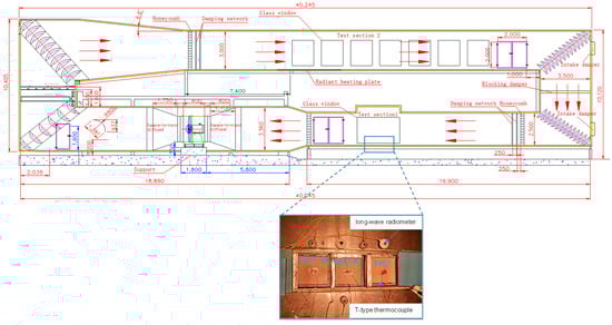 In pursuit of a comprehensive analysis of the hygrothermal characteristics inherent to HCCTs, the primary investigation focused on the initial test section within a wind tunnel expressly designed for hot and humid climates. This innovative wind tunnel bifurcates into two distinct sections: the former is dedicated to scrutinizing the thermal and humid milieu of the surrounding materials and the latter is dedicated to analyzing the atmospheric boundary layer, as delineated in Figure 2. The inaugural test section adeptly emulates conditions of heightened thermal and humid extremity, thereby facilitating a nuanced evaluation of building materials, components, and modules across diverse environmental scenarios. In contrast, the latter test section emulates both neutral and non-neutral atmospheric boundary layers, rendering it particularly apt for inquiries into phenomena such as urban heat islands and regional planning. The dimensional specifications of the primary test section are calibrated at 3.0 × 2.5 × 6.0 m and it is equipped with a suite of instruments, including a temperature stratification device, a turbulence generator, a hot-and-cold radiant plate, and a model turntable with a 2.4 m diameter aligned along the airflow direction. This sophisticated platform excels in the meticulous replication of complex meteorological parameter environments. For further elucidation on the intricate design parameters of the wind tunnel, we direct readers to our antecedent work [13].