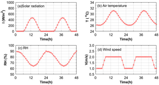 The perimeter boundary and bottom surface of the HCCT were set to thermal insulation, and the initial temperature was set to 20 °C. The ambient temperature, solar radiation, humidity, and wind speed were consistent with the wind-tunnel meteorological data, and the convective heat flux on the surface of the HCCT was calculated as follows:
