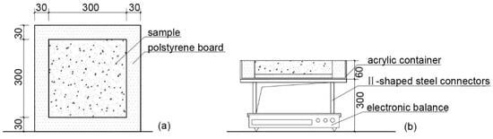 Meteorological parameters were calibrated to mimic the prevalent weather conditions in Guangzhou, as delineated in Figure 3, in strict adherence to the design standards articulated in JGJ 286-2013 [20]. In order to monitor the evaporation during the evaporation process, a BW32KH-series electronic scale (measuring range: 0–32 kg, accuracy: 0.01 g) was used to continuously and automatically record the quality changes in the samples (Figure 4). The sample to be tested was placed in a square box made of acrylic, and its four sides and bottom were wrapped with polyethylene foam plates to cut off the influence of local heat sources around the evaporation of the specimen, so as to ensure heat transfer from the surface of the specimen to the interior. The sample surface was adjusted to be consistent with the illumination of the light source by adjusting the height supported by the type II stainless-steel bracket under the acrylic box. The electronic balance, intricately linked to a computer via a professional transmission line, systematically recorded alterations in specimen mass on a minute-by-minute basis. Temperature alterations in the specimens were monitored with a high-precision T-type thermocouple line affixed to the specimen’s surface, securely bonded with heat-conducting silica gel. The opposing terminus of the thermocouple line was interfaced with a data acquisition instrument. The entire duration of the evaporation experiment spanned 48 h, during which all samples were preconditioned by saturation through immersion in distilled water.