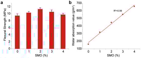 Effect of different SMO contents on the properties of HCCTs: (a) flexural strength; (b) water absorption.
