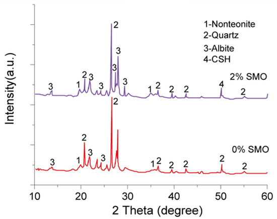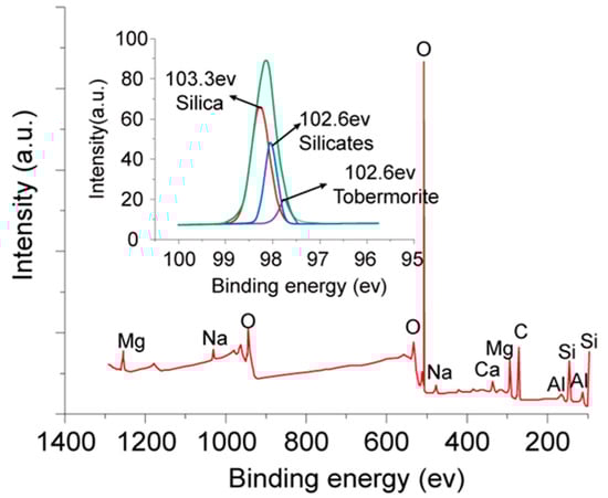 To explore the mechanism by which SMO improves HCCT strength, we measured the XRD spectra, presented in Figure 7, of samples prepared without and with the 2% addition of SMO. This figure indicates that the diffraction pattern of the HCCTs prepared with SMO has characteristic diffraction peaks corresponding to hydrated calcium silicate, confirming the formation of calcium silicate hydrate (C-S-H). Further insight is provided by Figure 8, presenting the full-spectrum X-ray photoelectron spectroscopy (XPS) scans of the samples. Seven prominent photoelectron lines of O 1s, Si 2p, Mg 2p, Al 2p, C 1s, Ca 2p, and Na 2p indicate the presence of O, Si, Mg, Al, C, Ca, and Na elements in the samples. Peak-fitting of the Si 2p photoelectron line revealed binding energies of 103.3 eV, 102.6 eV, and 101.7 eV, aligning with the phases of silica, silicate, and tobermorite, respectively, as established by Black et al. [21]. The existence of tobermorite, a calcium silicate hydrate mineral with a Ca/Si ratio of 5:6, further confirms the formation of C-S-H phases in the samples with the addition of 2% SMO.