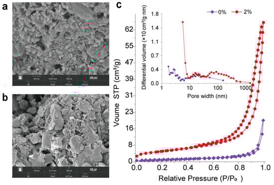Microstructural analysis of HCCTs: (a) SEM images of HCCTs without SMO addition; (b) SEM images of HCCTs with 2% SMO addition; (c) N2 adsorption–desorption curves and pore size distribution for HCCTs with 2% SMO and without SMO.