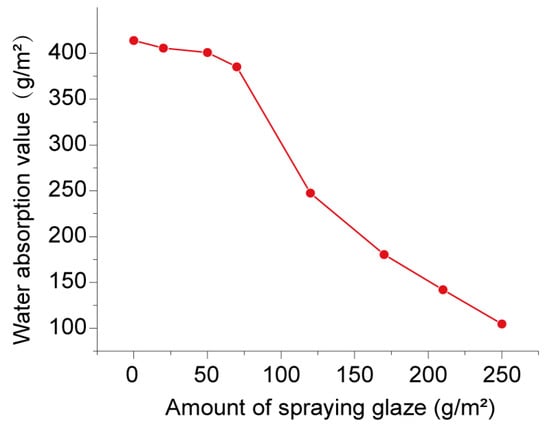 Observations of this figure reveal that, as the amount of glaze sprayed on the ceramic brick body’s surface increases, the water absorption of the glazed HCCTs within the high humidity range (70–95%) gradually diminishes. When the spraying amount is below 70 g/m2, the reduction in moisture absorption is relatively gradual. However, exceeding the threshold of 70 g/m2 leads to a rapid decline in moisture absorption. This highlights a direct correlation between the quantity of sprayed glaze and the hygroscopic properties of the ceramic tiles. Excessive glaze on the surface obstructs nano-pores, diminishing the hygroscopic properties of the ceramic tiles through the melting and blocking of the glaze.