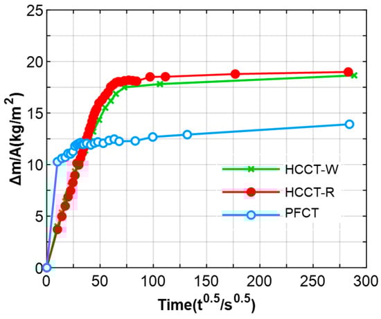 Figure 11 illustrates the water absorption profiles of the three porous tile specimens. These profiles demonstrate a common trait, featuring a rapid water absorption rate during the initial stages, followed by a relatively slower rate in the later stages. The outcomes of the single-side immersion test indicate that the two types of humidity-controlling ceramic tiles exhibit similar water absorption process. Table 3 further compares the water absorption coefficient of the three porous tile specimens. The results from the single-side immersion test revealed that the first-stage water absorption coefficients (S1) of HCCT-W and HCCT-R were 3.69 × 10−2 and 3.65 × 10−2 mm/s0.5, respectively. These values were approximately 30% lower than that of the PFCT. This disparity is attributed to the capillary water absorption’s connection to the pore-related structural characteristics of porous tile, including factors like porosity, pore size, and pore shape.