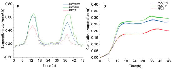 Figure 12 compares the hourly evaporation rates and cumulative evaporation over time for the aforementioned three saturated porous tile samples. It is evident that the hourly evaporation rates for the porous tiles closely follow the fluctuations in solar radiation. The specimens exhibited substantial evaporation during the daytime but minimal evaporation at night, underscoring the predominant influence of solar radiation intensity on water evaporation. At noon on the first day after water spraying, both the HCCT-W and HCCT-R specimens reached similar peak evaporation rates, at approximately 0.63 kg/(m2·h) and 0.61 kg/(m2·h), respectively, while the evaporation rate of the PFCT specimen was only 0.42 kg/(m2·h). However, these rates decreased to nearly zero during the night. This is attributed to the porous ceramics absorbing moisture from the near-surface air at night. On the second day, the evaporation rates of all specimens declined to varying degrees. The HCCT-R specimen peaked at an evaporation rate of about 0.61 kg/(m2·h), while the HCCT-W specimen was only approximately 0.52 kg/(m2·h), with the difference between the two gradually widening. This is attributable to the fact that when their initial water retention volumes are equal, the HCCT-R specimen has a lower surface solar radiation reflectance; thus, road surfaces built with this material would be more prone to water evaporation due to its increased capacity to absorb solar radiation. Regarding 48 h cumulative evaporation, the HCCT-R specimen sustained evaporative cooling for a longer duration than the HCCT-W specimen (Figure 12b).