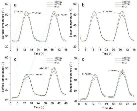 In the dry state (Figure 13a,b), the PFCT specimen had the highest temperature (52.0 °C), followed by the HCCT-R specimen (51.8 °C), and then the HCCT-W specimen (48.9 °C). This variation may be related to surface reflectivity, as surfaces with higher reflectivity tend to absorb less solar radiation. At night, the surface temperatures of the HCCT specimens were slightly lower than that of the PFCT. This is due to the high emissivity of porous ceramic, allowing for the dissipation of surface heat through thermal radiation heat transfer at night, resulting in a decrease in the nighttime surface temperature.