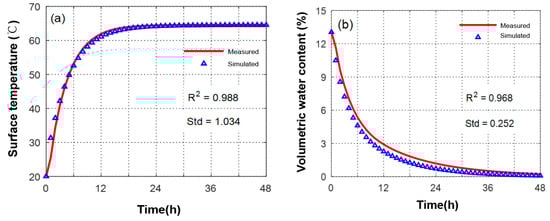 Simulated and measured values in the evaporation process of HCCTs: (a) surface temperature; (b) volumetric water content.