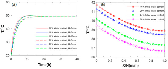Temperature field of HCCTs: (a) temperature variation at different thicknesses; (b) temperature distribution across different initial water contents.