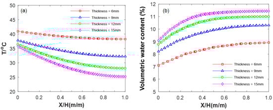 Influence of thickness on temperature–moisture field in HCCTs: (a) temperature; (b) moisture.