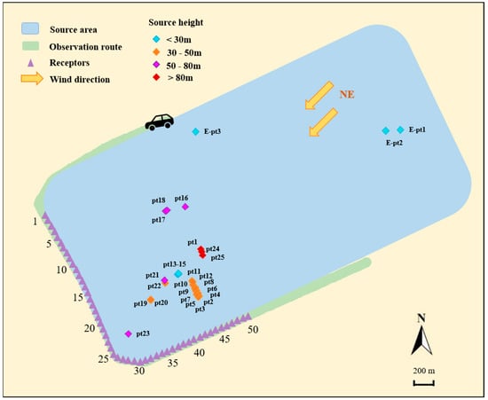 The measurement resolution of the vehicle-mounted NOx analyzer is 1 ppb, and the measurement error of the equipment is about ±10%. The temporal resolution of the concentration data collected by the driving vehicle is 5 s, and the corresponding spatial resolution is about 20–30 m. However, the spatial resolution of atmospheric pollutant diffusion models is difficult to achieve such a high precision. The spatial resolution of the small and microscale diffusion models, which are more commonly used in the literature, is more than 100 m. If the spatial resolution of the source resolution is too large, the loss of spatial accuracy of navigation observation data will be too large. In order to perform the inversion, the continuous monitoring of the NOx concentration on the road was spatially averaged at 50 m intervals, and the purple triangular symbols in Figure 1 indicate the starting and ending points of the road section taken in the inversion. A total of 50 source-resolved receptors were actually set after the spatial averaging process, and they were numbered in the order of the direction traveled by the observation vehicle.