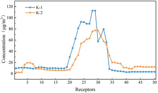 The overall concentration range of NOx during the two observation cases was about 10.4–150.3 μg/m3, and the maximum concentration of NOx collected was about 77.3–112.7 μg/m3 higher than the background concentration. Figure 2 shows the observed NOx concentration along the route after deducting the background concentration. The high concentration values were concentrated in the range of 20–34 and 21–39 of the receptors, respectively, both located in the southwest direction outside the enterprise. The spatial distribution span of concentration peaks was about 750 m.