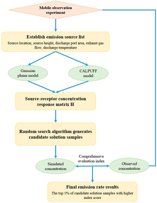 The inversion algorithms used by many scholars in source analysis studies are usually strategic stepwise searches, as mentioned earlier. However, it is difficult to meet the timeliness requirements of practical management work when the dimensionality of the solution problem is large. Therefore, an inversion scheme based on random search and solution set optimization was adopted in order to achieve a fast estimation of the emission rate. Figure 3 shows the emission rate estimation process adopted in this study, which mainly includes the following: