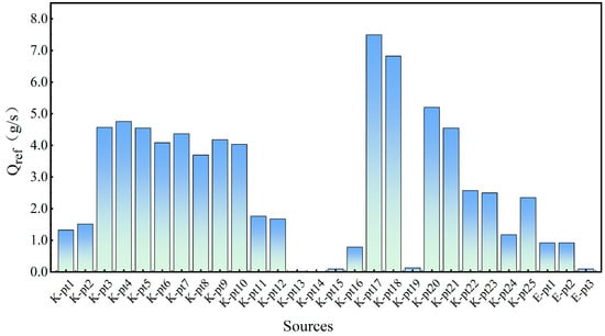 The reference emission rates for each source are given in Figure 4. The sum of the reference emission rate of all sources was 76.2 g/s, and the reference emission rate from Enterprise K was 74.2 g/s. The highest value of the reference emission rates was in K-pt17, followed by K-pt18; the lowest values of the reference emission rates were found in K-pt13 and K-pt14; and the values of the emission rates of Enterprise A and Enterprise B were overall smaller than those of Enterprise K.