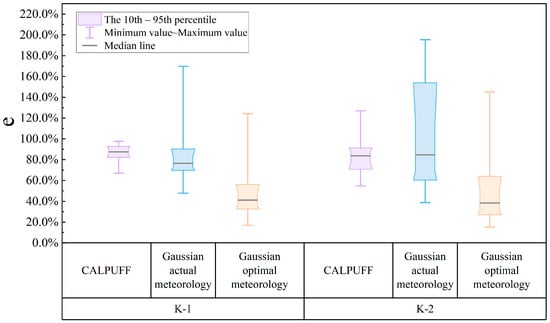 The concentration relative errors of 50,000 random samples were used as an example to analyze the differences between different matrix H simulation schemes. Figure 5 shows the statistical distribution of e under different simulation schemes. The sample size of the random search was relatively large, so the variation range of e is also relatively large. Take K-1 as an example. The value range of e in CALPUFF’s simulation result was 67.0–97.7%. The value range of e of the Gaussian plume model was 47.7–169.8% under actual weather conditions, while the value range of e based on variable weather conditions was 17.0–124.4%. Emission rate estimation was used to find the solution with a small relative error of concentration by comparing the minimum of e under different simulation schemes. It can be seen that in the inverse calculation results of the two cases, the relative error of concentration simulated by CALPUFF under actual meteorological conditions was the highest, and the minimum values of e of K-1 and K-2 were 67.1% and 54.8%, respectively. The relative error of corresponding concentration in the simulation scheme based on the Gaussian plume model with actual meteorological parameters was smaller, and the minimum value was 47.7% in case K-1 and 38.7% in case K-2. Although the actual meteorological conditions were referred to, the difference between the simulation results based on the two simulation schemes was very significant. It could be seen that the influence of meteorological data on the accuracy of inverse calculation is very important. A simulation scheme with variable meteorological conditions was used to further solve the problem because it was considered that the real-time wind was dynamically changing. Compared with the previous two simulation results, it was found that the minimum relative error of concentration in the simulation scheme with variable weather conditions was the lowest, and the minimum error of the two cases was 17.0% and 15.2%, respectively. From the comparison of the concentration error of the simulation results, the inverse calculation results considering the fine-tuning of meteorological parameters had been significantly improved.