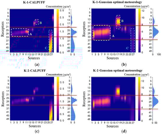 Matrix H outputs for different simulation schemes: (a) K-1 simulation results based on CALPUFF; (b) K-1 simulation results based on Gaussian plume model; (c) K-2 simulation results based on CALPUFF; (d) K-2 simulation results based on Gaussian plume model. The heat map on the left side of each subgraph represents the concentration–response values at each receptor for each source’s emissions, μg/m3; the right-hand side bar graph shows the total concentration at each receptor due to emissions from all sources, μg/m3; the location of the red line on the right side indicates the spatial extent corresponding to the peak of the concentration–response wave. Dashed box A represents the range of receptors affected by the emission of K-pt2–K-pt12, dashed box B represents the range of receptors affected by the emission of K-pt17–K-pt18, and dashed box C represents the range of receptors affected by the emission of K-pt26–K-pt27.